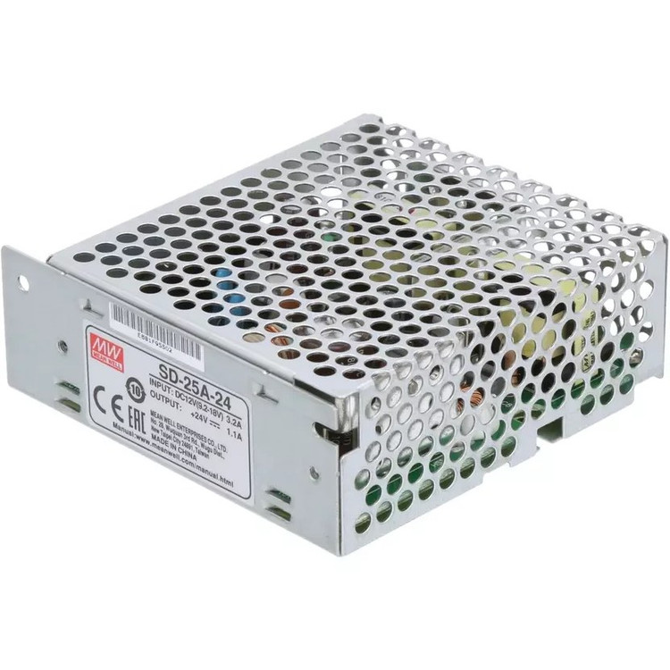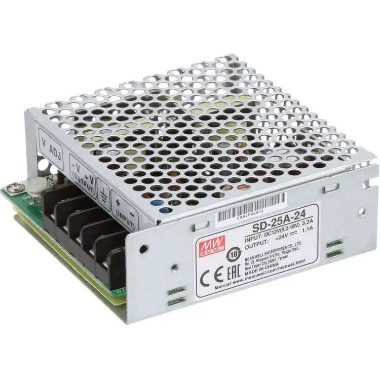 منبع تغذیه SD-25A با ورودی برق 18 ~ 9.2 ولت DC کار میکند و در سه مدل با ولتاژ خروجی 5 ولت، 12 ولت و 24 ولت در دسترس است.